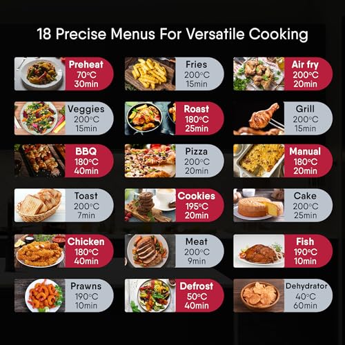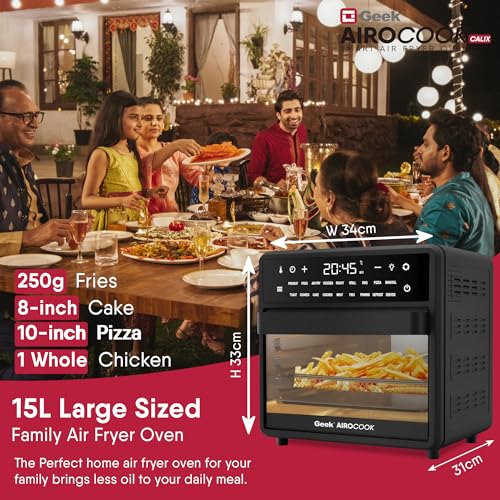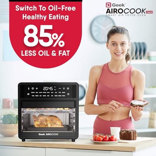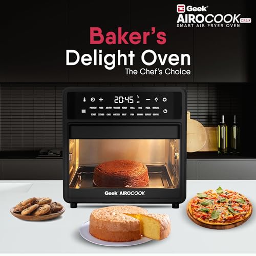 One-touch Operation: The Geek Airocook Calix 15L Airfryer Oven boasts 18 preset menus and a user-friendly LED touch screen, simplifying all your culinary desires into a single click. Whether it’s crispy French fries, succulent chicken wings, delectable cakes, mouthwatering pizza, perfectly toasted bread, fruit drying, or reheating leftovers you can make it with one click. Additionally, you have the flexibility to fine-tune temperature (up to 200°C) and time (up to 90 minutes) to suit your taste.