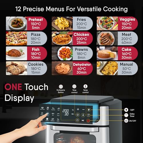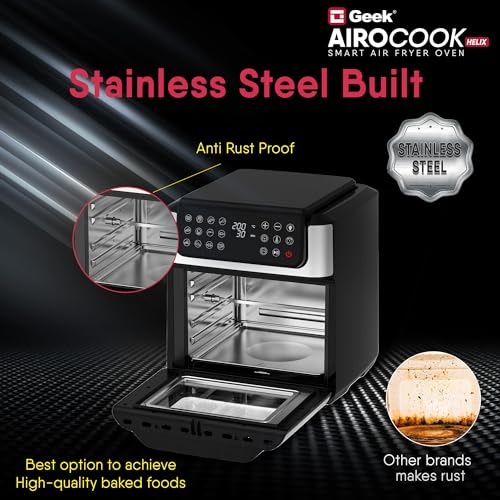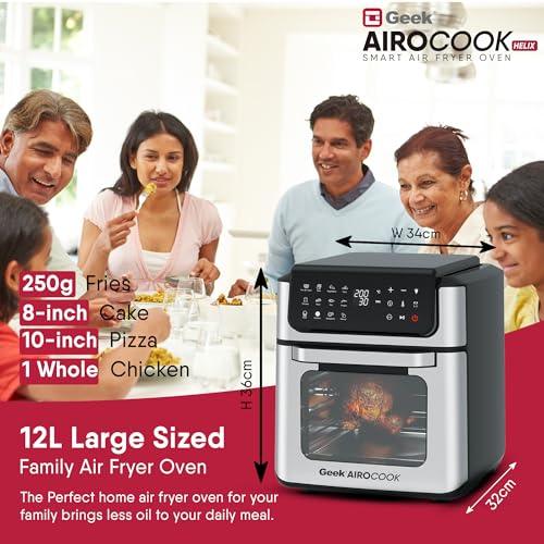 One-touch Operation: The Geek Airocook Helix 12L Airfryer Oven boasts 12 preset menus and a user-friendly LED touch screen, simplifying all your culinary desires into a single touch click. Additionally, you have the flexibility to fine-tune temperature (up to 200°C) and time (up to 60 minutes) to suit your taste.