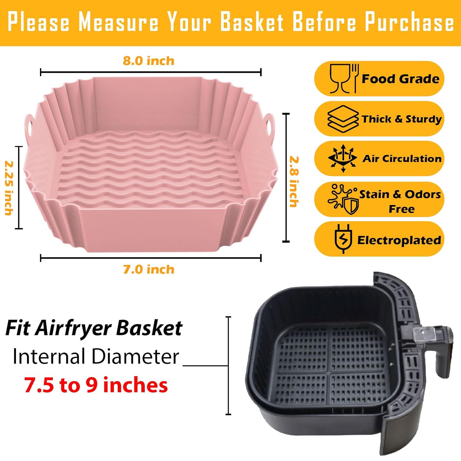 【MEASURE YOUR BASKET】 Our Air Fryer Liners measuring dimensions Top (8×8 inch) x Bottom (7×7 inch) x Height (2.8” inch) ensure a fit in all Air Fryer Baskets with internal diameter (7.5” to 9”) inches whether Round or Square. Please verify your Air Fryer pot/basket size before purchasing.