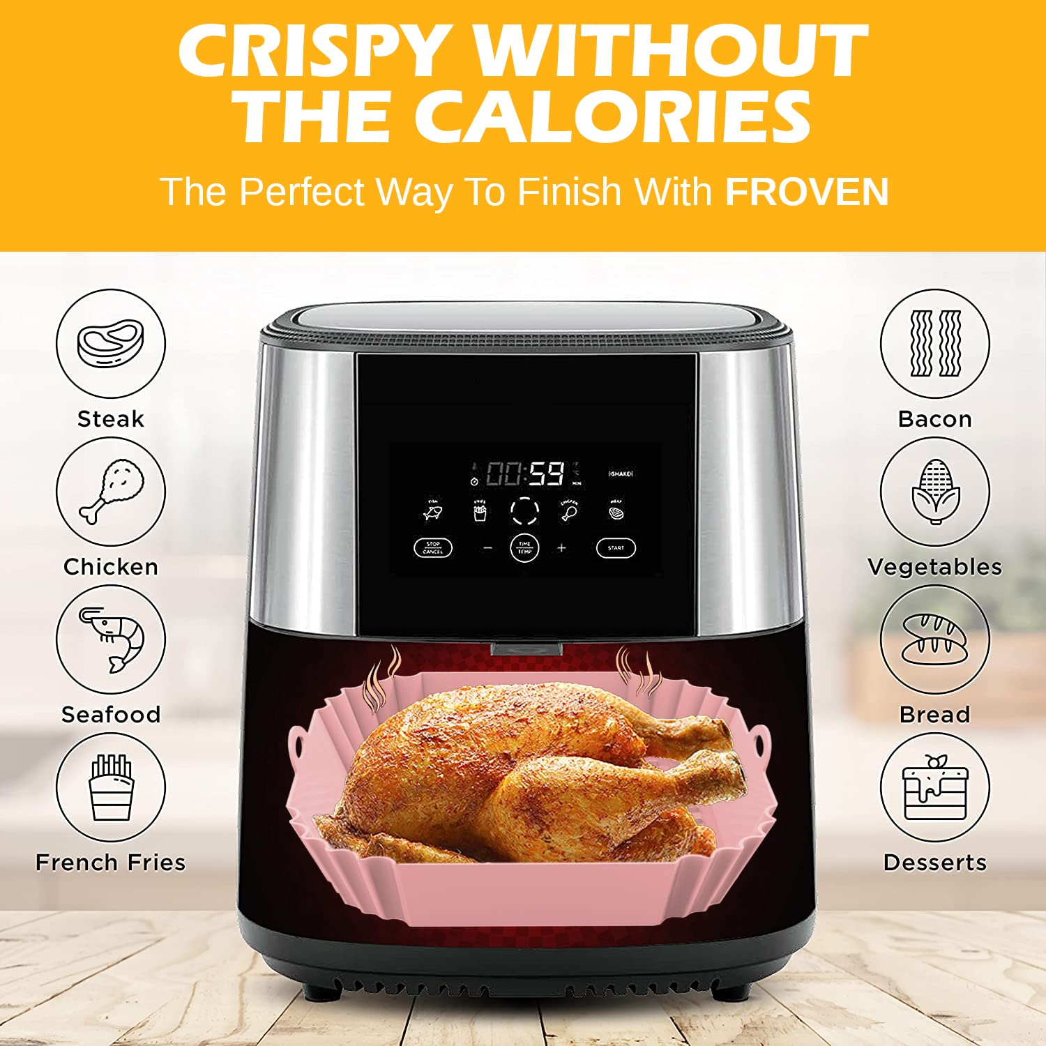 【COMPATIBLE DEVICES】 Experience optimal performance with FROVEN Air Fryers Liners in leading brands like Ninja, COSORI, Instant Vortex, Drew Barrymore, Chefman, DASH, CRUX, Paris Hilton, SUR LA TABLE, Philips, PowerXL, Gourmia, Veken, Beelicious, Nuwave, BELLA, Cuisinart, Elite Gourmet, Instant Pot, Ultrean, TOSHIBA, GoWise USA, and many more Air Fryers.