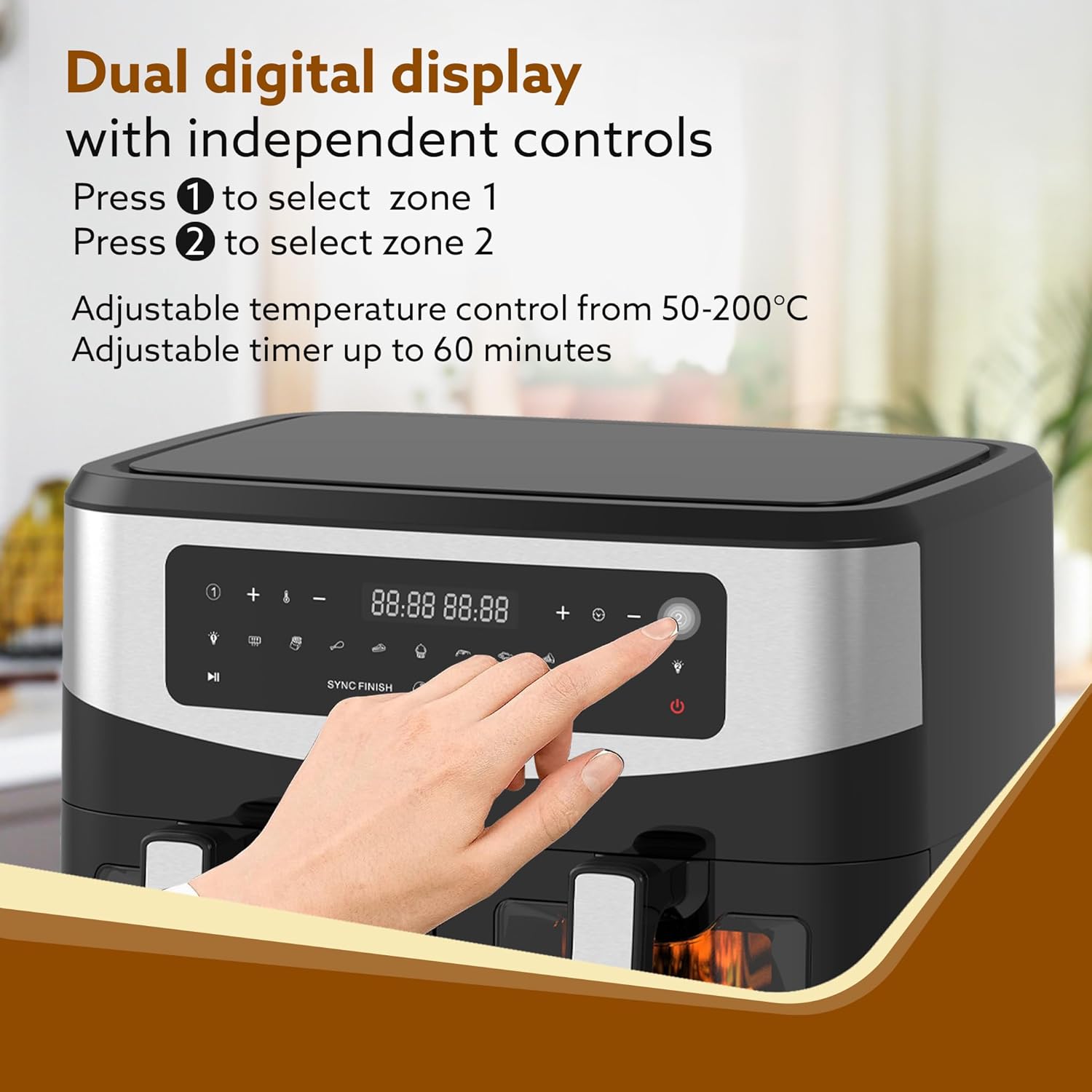 4.5L + 4.5L dual non stick independent frying basket with sync function. SYNC Finish: Cooks different food on different settings & finish at the same time. Dual Cook: Cooks same food on same settings in same time