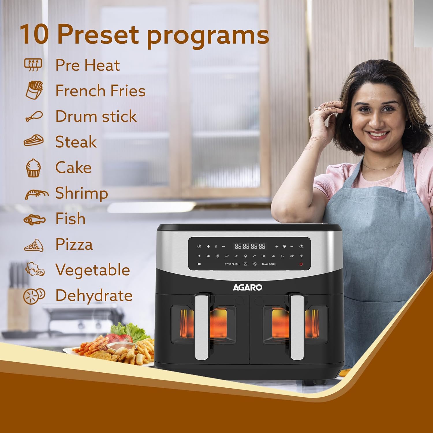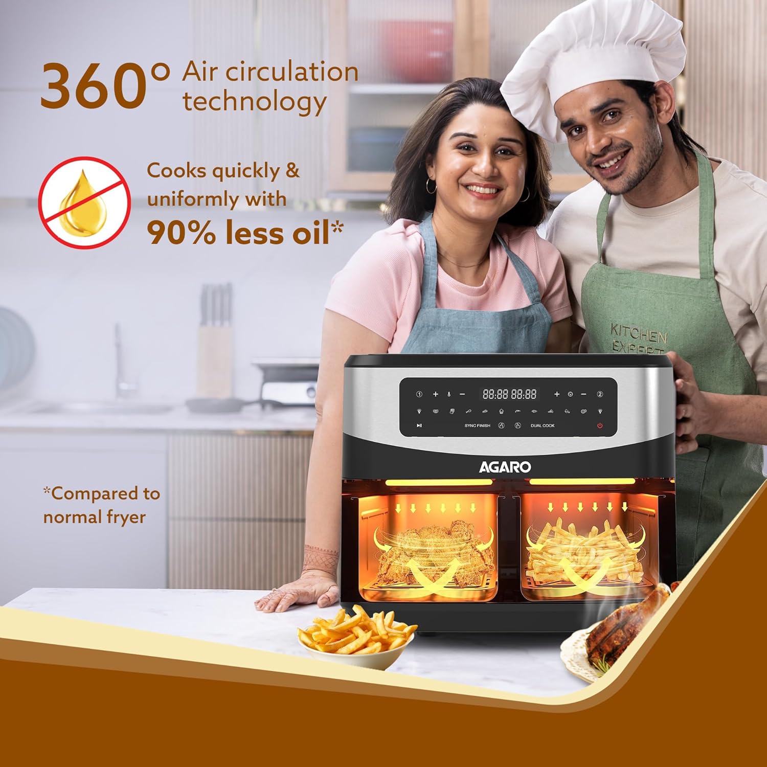 Home Kitchen & Home Appliances Kitchen Appliances Deep Fryers AGARO Imperial Dual Basket Digital Air Fryer, 9L Capacity (4.5L x 2), 10 Preset Cooking Modes, 360 Degree Air Circulation, Convection, Digital Display, 2400W, Bake, Roast, Toast & Dehydrate