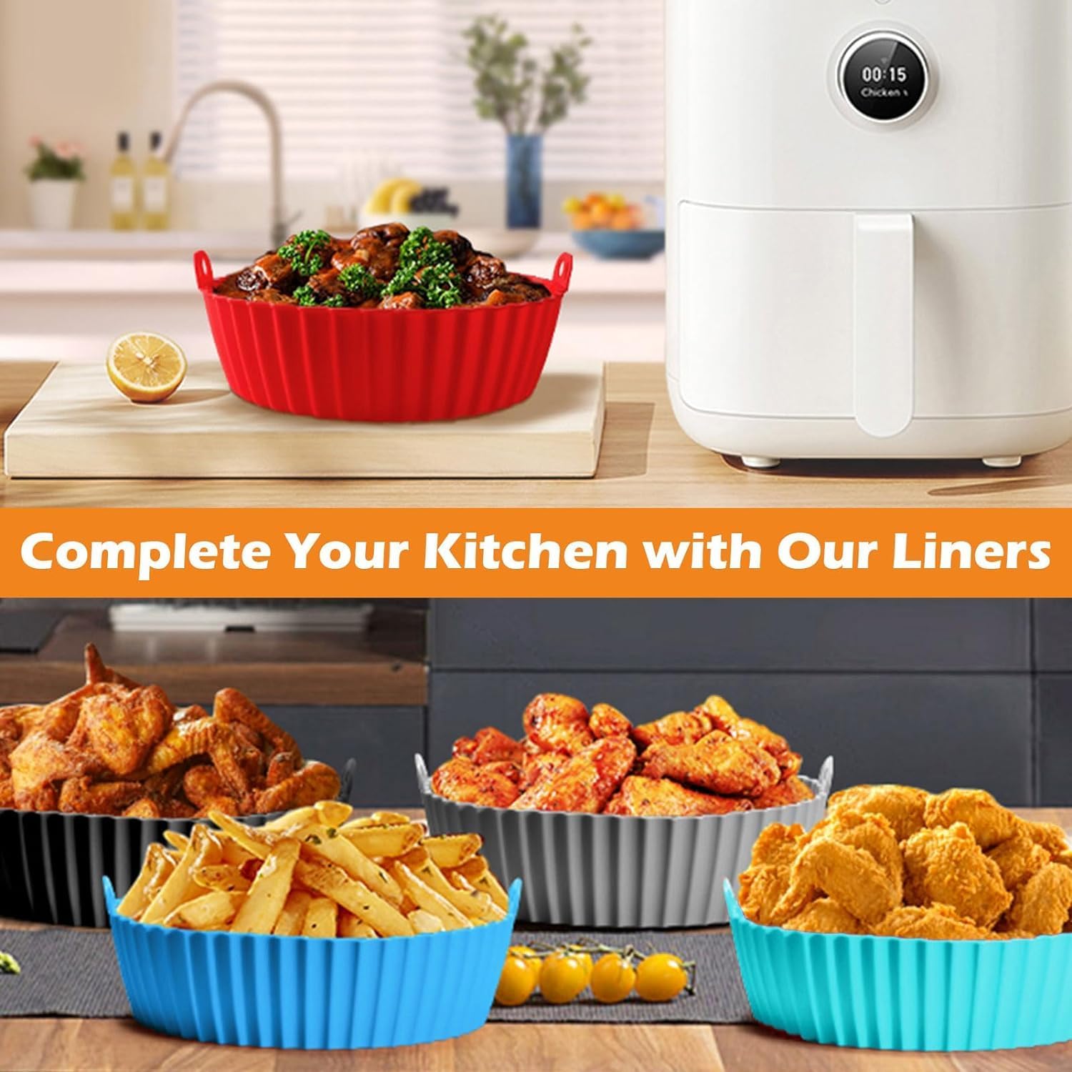 Package Content – Air Fryer Liners I Material: Silicone I Color: Multicolor I Shape: Round I Size: top diameter: 8 inches, bottom diameter: 6.5 inches; height: 2.4 inches and Top 6.5 inches / Bottom 5.5 inches/ Height 1.8 inches.I Raised lines on the base allows proper and even circulation of heat. Safe to be used in oven, microwave, freezer and dishwasher I 3D drainage groove, which facilities the oil to flow to the edge groove and the food tastes more delicious.