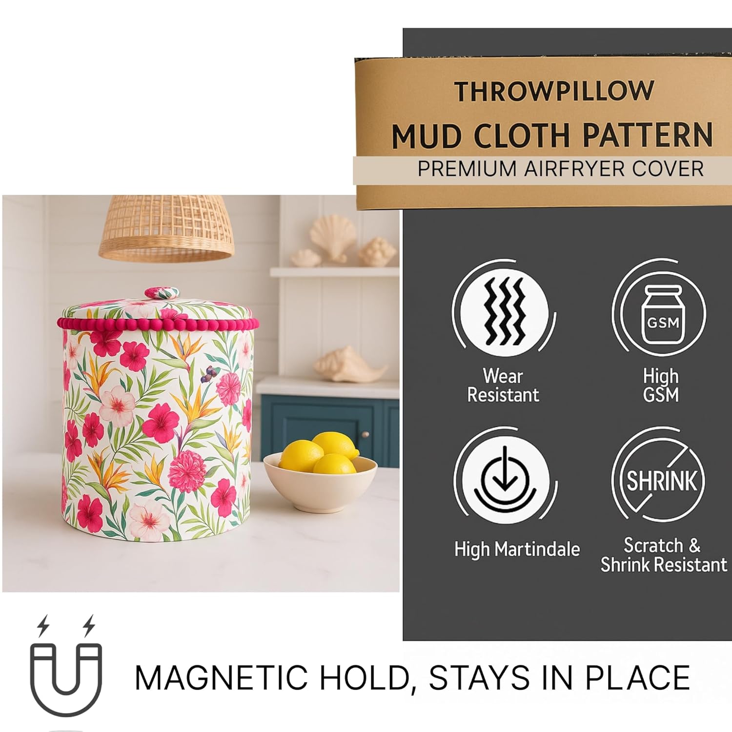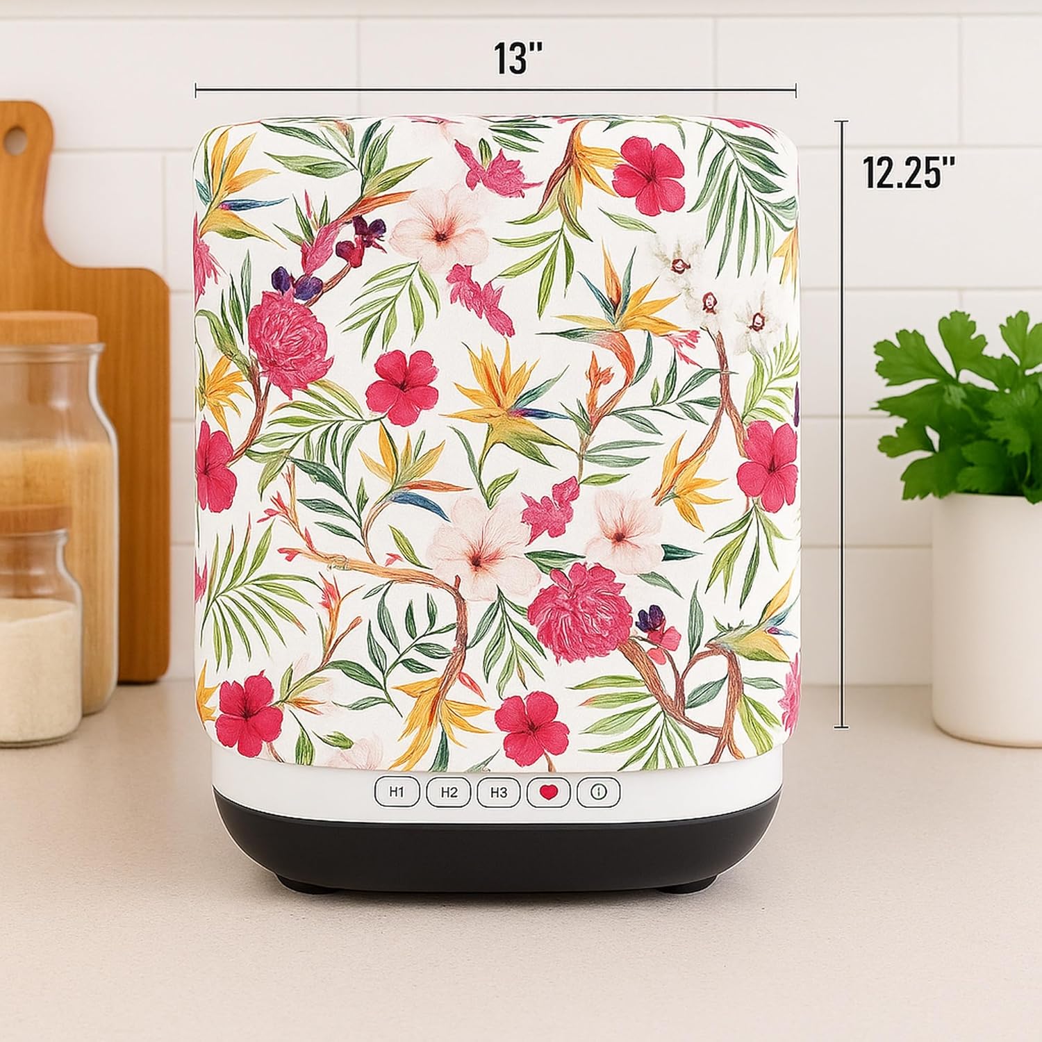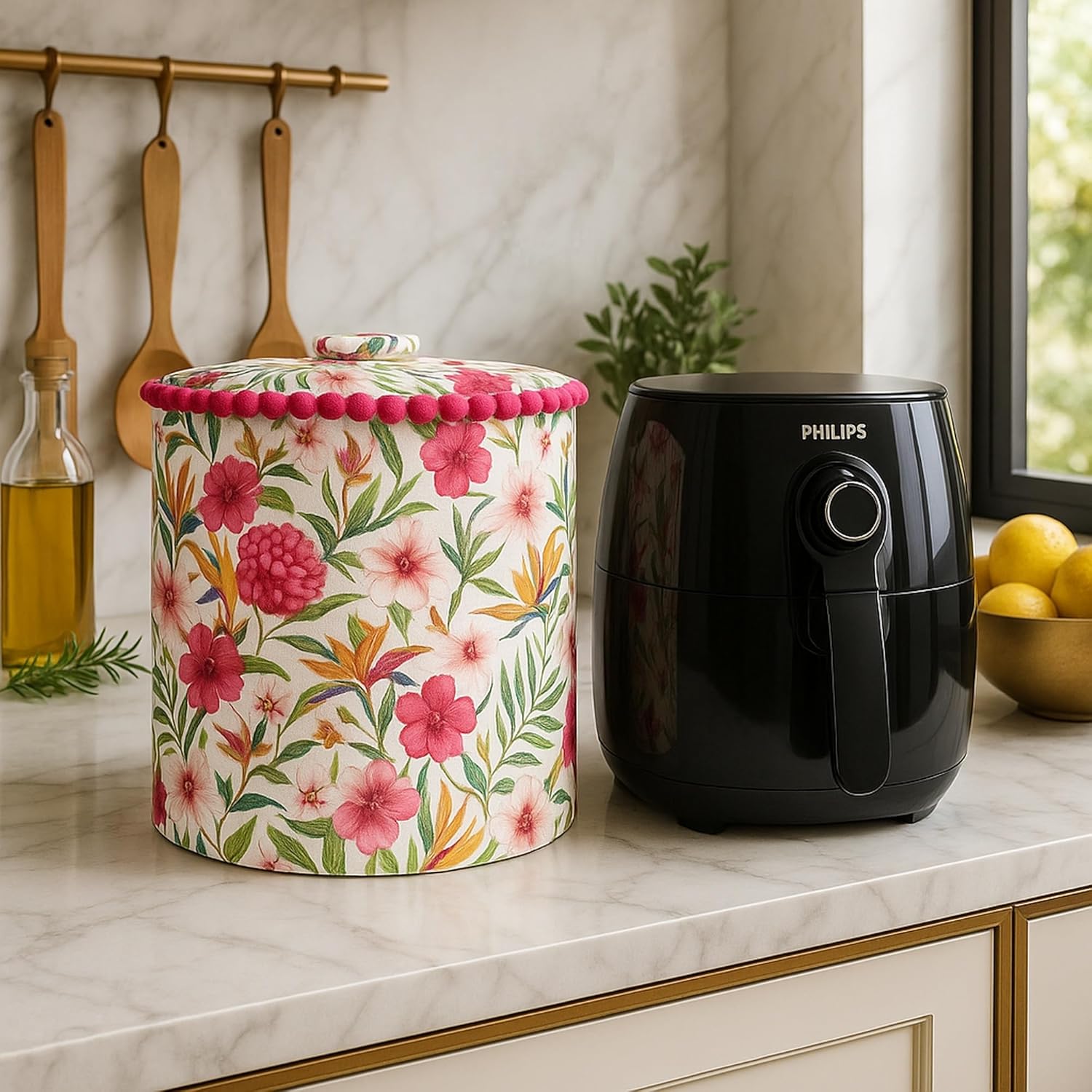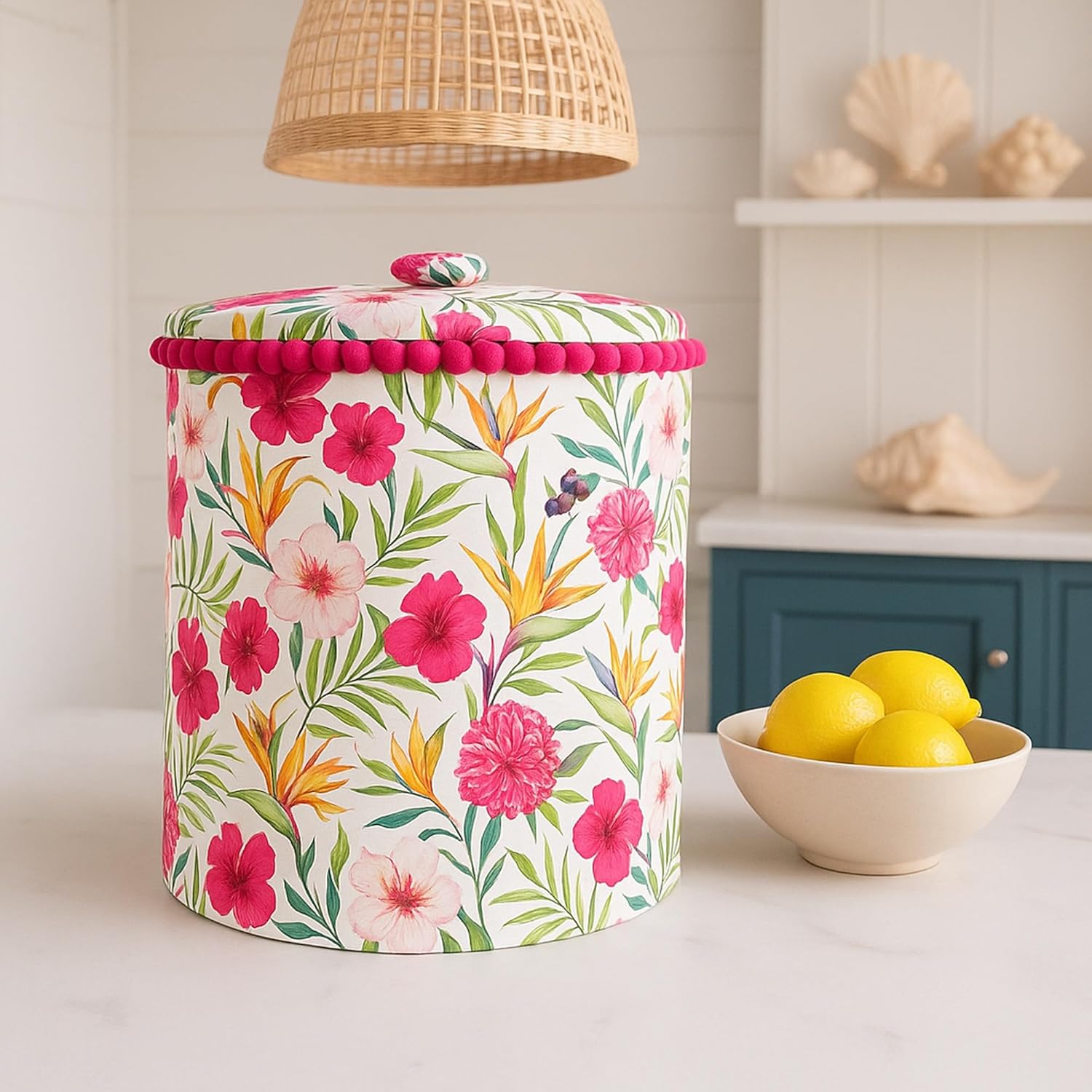 ✅ Protects Against Dust, Grease & Stains This mixer grinder cover offers all-around protection against dust, grease, stains, and daily fingerprints. A must-have for Indian homes and busy kitchens, it keeps your appliance spotless and reduces the need for frequent cleaning. Ideal for those searching mixer grinder dust cover, kitchen appliance cover, or protective decorative mixer cover for daily use. Add a bold statement to your kitchen while protecting your appliances with our Mixer Grinder Cover with Handle & Pink Pom Pom – Floral Print. Specially designed to fit most standard-size mixer grinders, this round mixer grinder cover features a 10″ height and 9″ diameter, ensuring a snug fit for brands like Philips, Sujata, Preethi, Agaro, Bajaj, and more. Crafted from high GSM, thick and breathable fabric, this dustproof mixer grinder cover offers excellent protection from dust, stains, oil, and moisture.It ensures your appliance stays clean and scratch-free even in heavy-use kitchens. The Floral printed mixer grinder cover adds a touch of ethnic elegance with a modern twist, while the bright pink pom pom lace around the top brings a splash of color. A fabric top handle makes this mixer grinder cover with handle extremely convenient to lift and use daily. This is more than just a stylish piece—it’s a functional kitchen appliance cover that’s also machine washable, making maintenance effortless. Simply toss it in the washing machine for easy, hygienic cleaning. Durable, breathable, and made for daily Indian kitchen use, it’s the perfect blend of form and function. Whether you’re looking for a mixer grinder cover for Preethi, a mixer cover for Philips, or a mixer grinder cover for Sujata, this versatile piece fits beautifully. Ideal for gifting or personal use, it’s a must-have for anyone browsing mixer grinder dust cover, decorative appliance covers, or designer kitchen cover