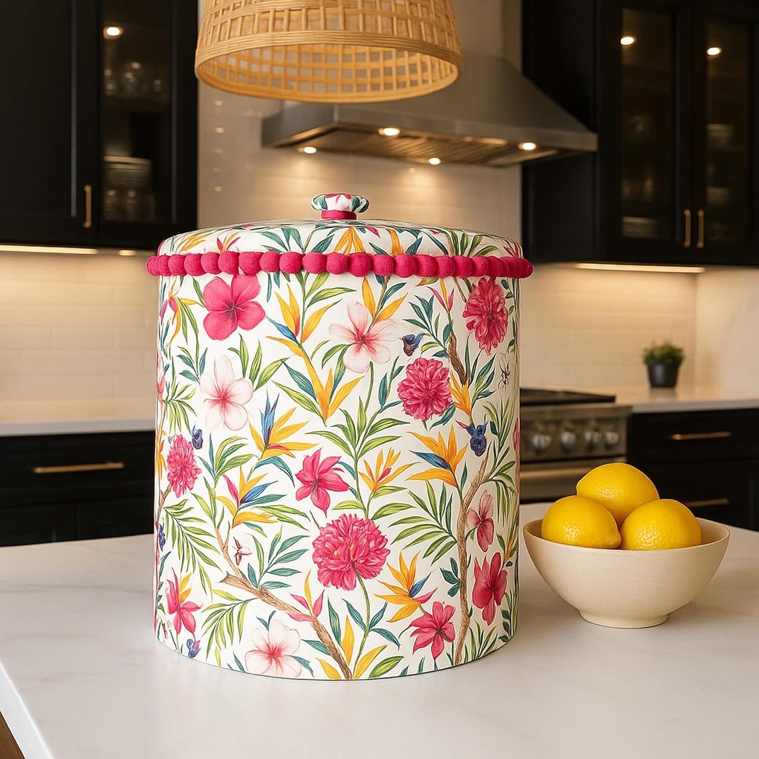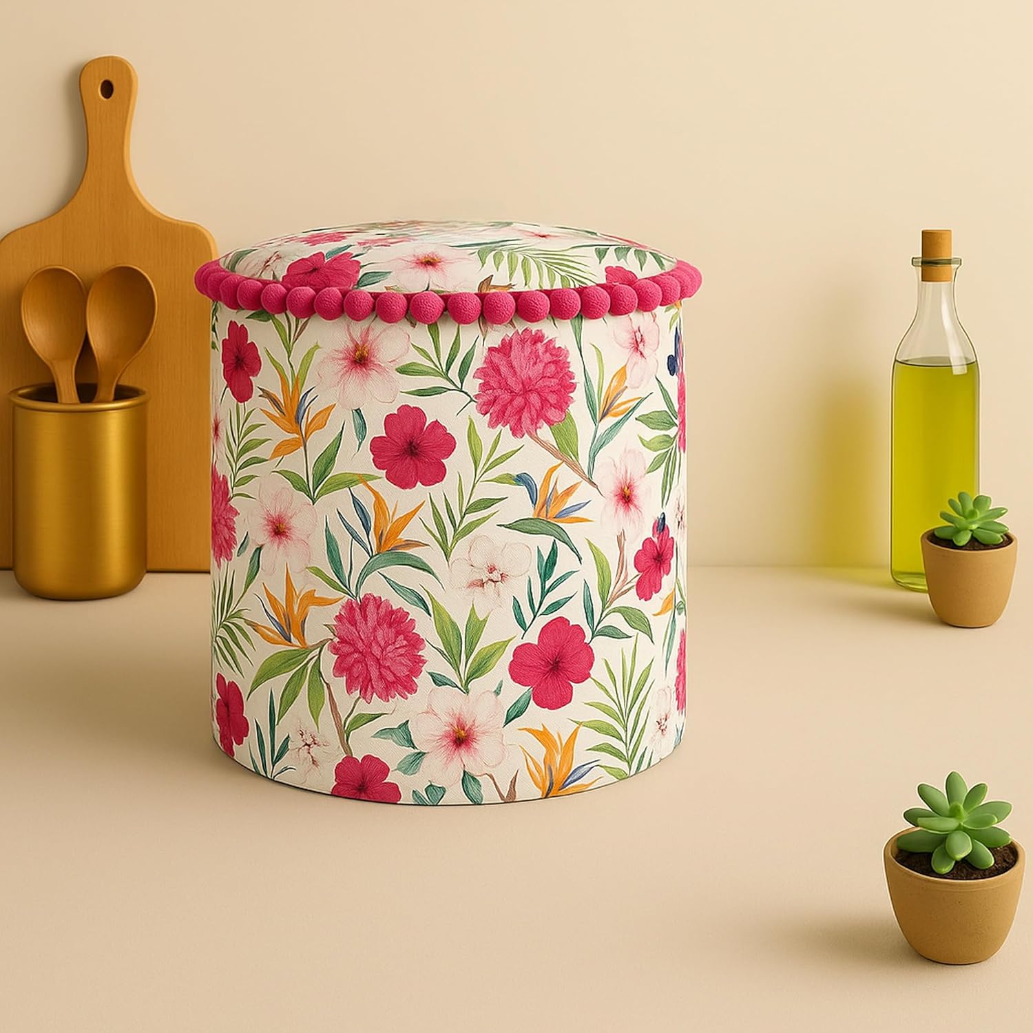 3️⃣ Designer Kitchen Décor in Floral Print Add a chic ethnic touch to your kitchen with this printed mixer grinder cover in a stylish Floral pattern. The hot pink pom pom trim adds feminine flair, making it a decorative appliance cover that doubles as kitchen decor. Ideal for buyers searching designer kitchen cover, decorative mixer cover, printed mixer grinder dust cover, or mixer grinder fabric cover with unique design appeal.