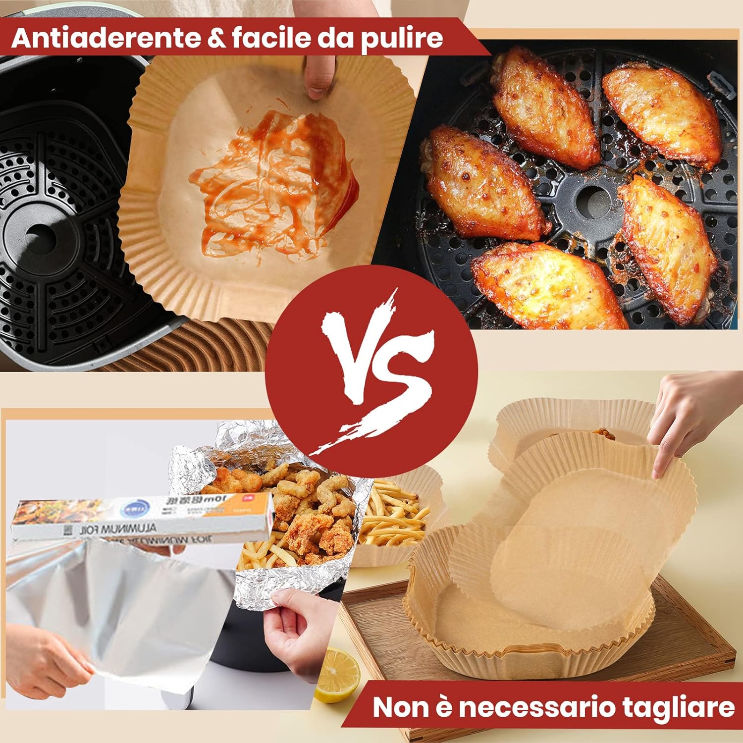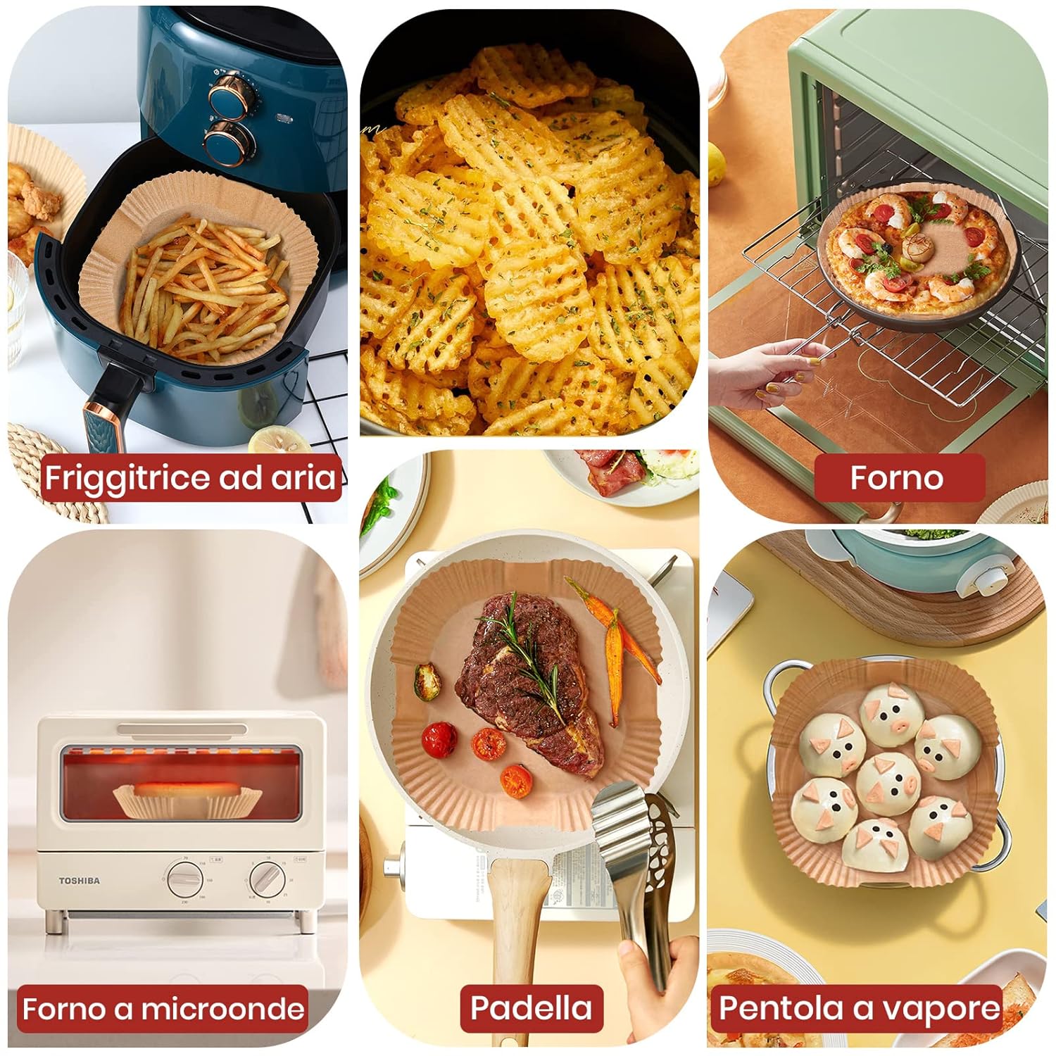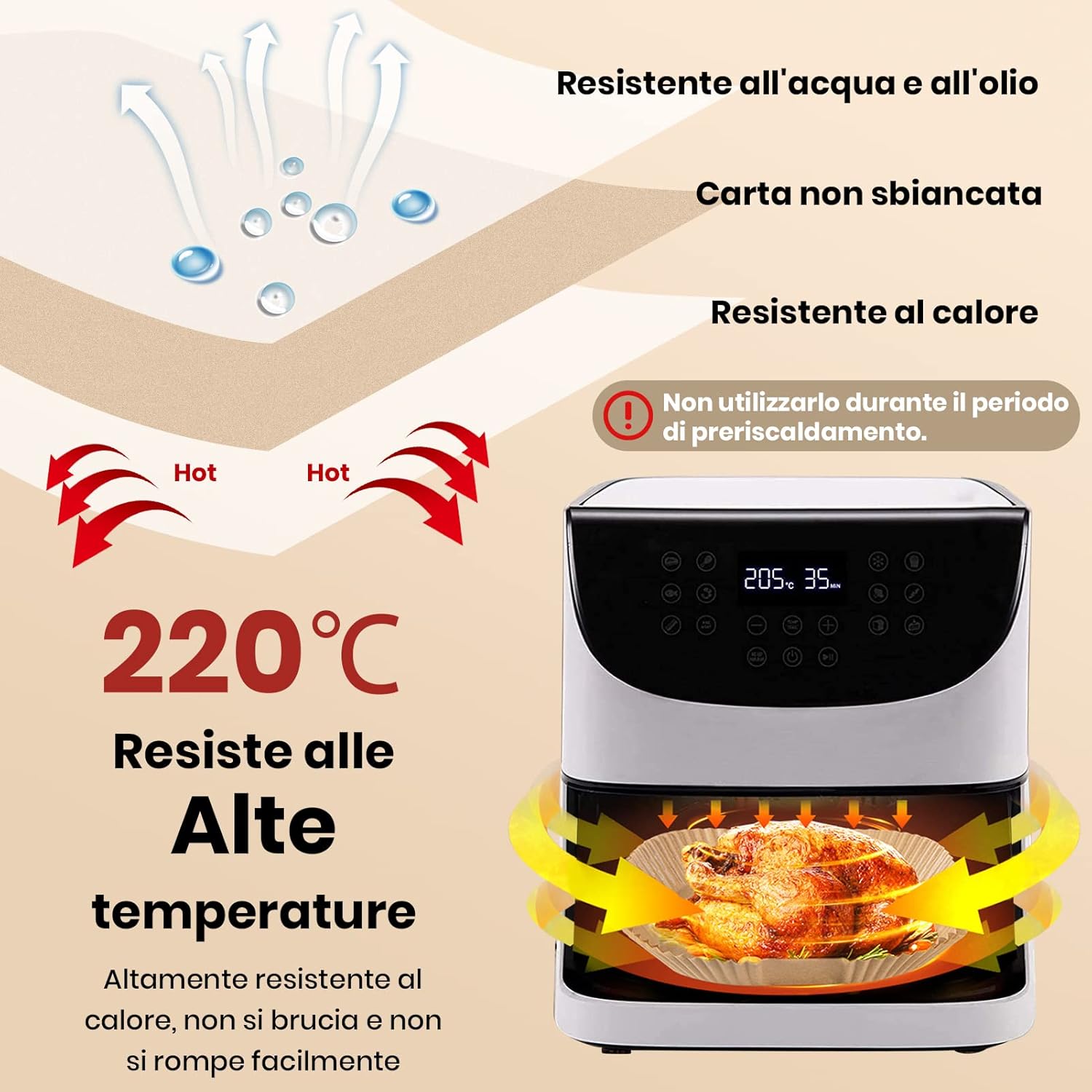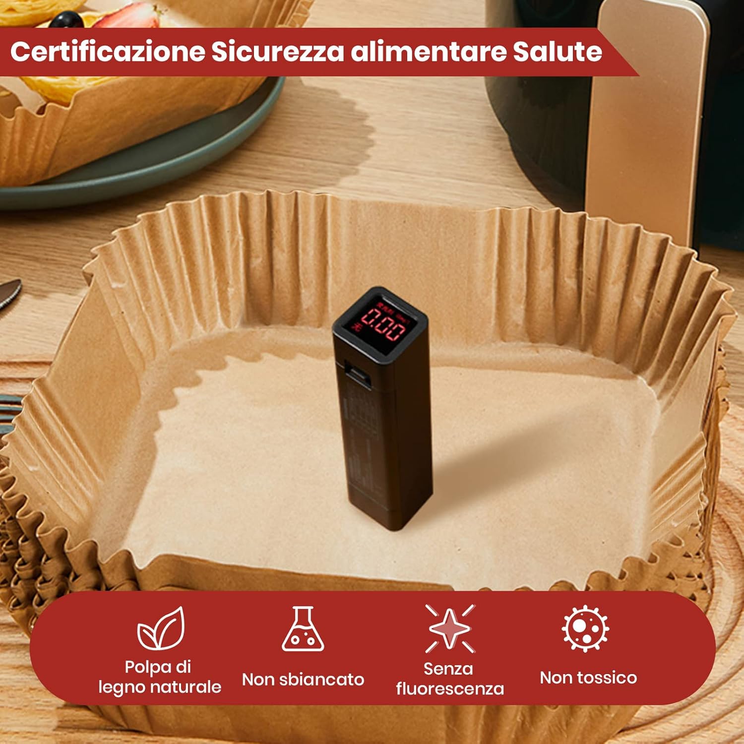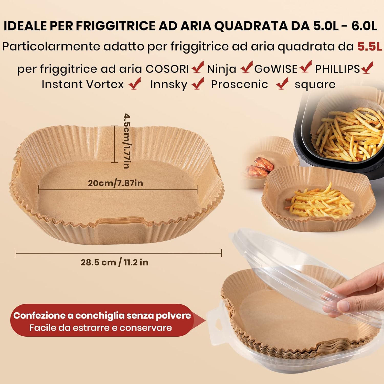 Easy to use: the improved baking paper airfryer has a square bowl shape for better food containment, they do not need to be torn, folded, cut or bent, are easy to use and can be used directly when cooking. 42 GSM thick airfryer liners are less likely to break and good heat resistance can withstand temperatures up to 220°C.