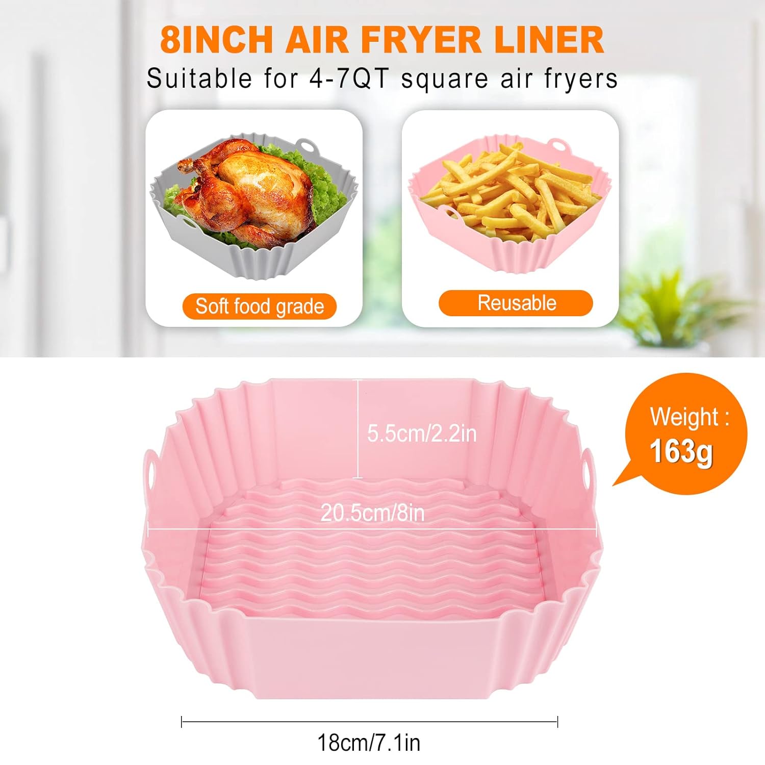 [2-PCS Air Fryer Silicone Liners] Our square silicone air fryer liners is thicker, It’s about 67mil thick, it’s not fragile. 8 inches/ 20.5 cm in side length, 2.2 inches/ 5.5 cm in height, Fits 4 to 7 QT Air Fryer.