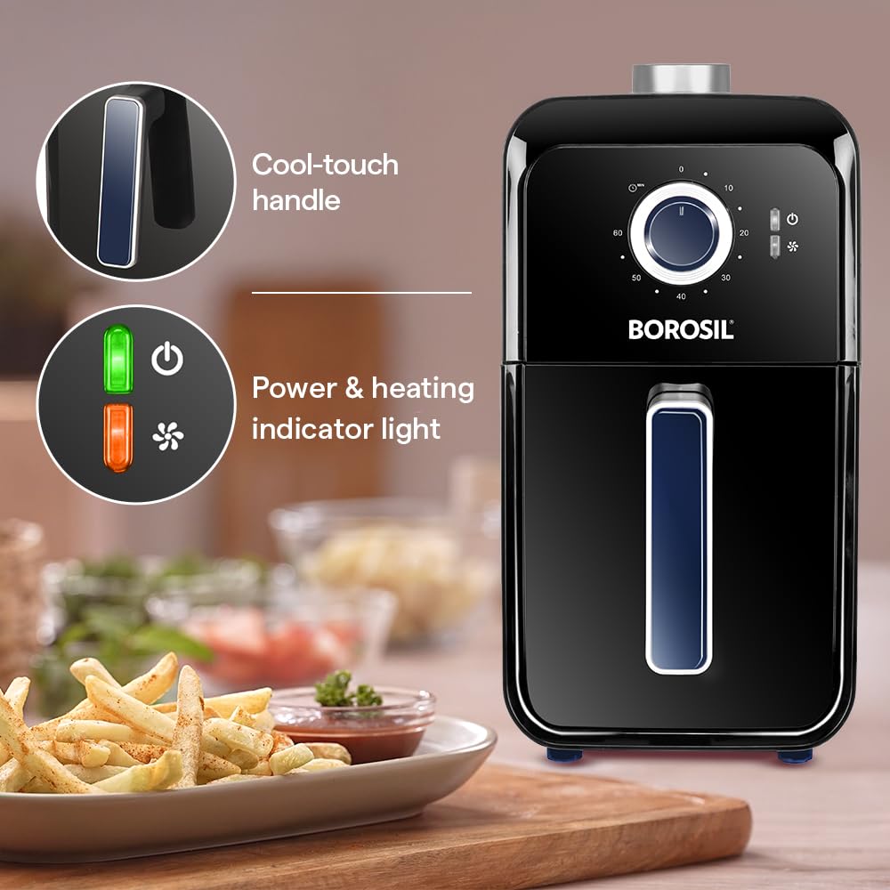 Home Kitchen & Home Appliances Kitchen Appliances Deep Fryers Borosil Best 1350W Slim Air Fryer (3.6 L) | 4 in 1 Function with QuickFry Technology, Auto Off Function | Air Fryer for Bake, Grill, Roast, Reheat etc. | 90% Less Oil | 2 Year Warranty | Black