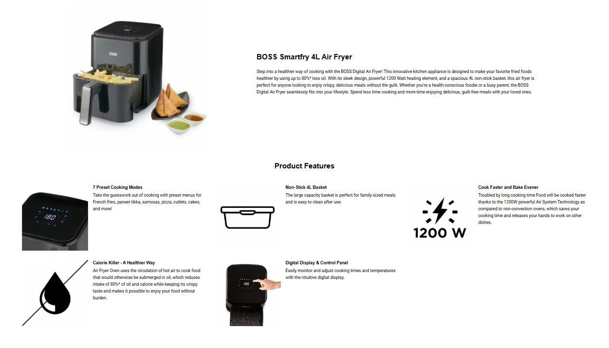 Step into a healthier way of cooking with the BOSS Digital Air Fryer! This innovative kitchen appliance is designed to make your favorite fried foods healthier by using up to 80%* less oil. With its sleek design, powerful 1200 Watt heating element, and a spacious 4L non-stick basket, this air fryer is perfect for anyone looking to enjoy crispy, delicious meals without the guilt. Whether you’re a health-conscious foodie or a busy parent, the BOSS Digital Air Fryer seamlessly fits into your lifestyle. Spend less time cooking and more time enjoying delicious, guilt-free meals with your loved ones.
