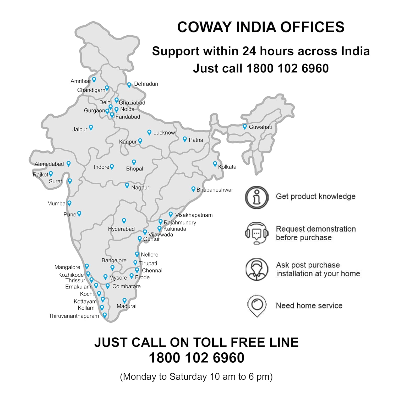 Door-step Services: With over 90 dedicated offices across India, Coway provides door-step service for all users. We offer free installation and home service, ensuring customer needs are prioritized. Simply reach out via our toll-free number for assistance with demonstrations and any service requirements.