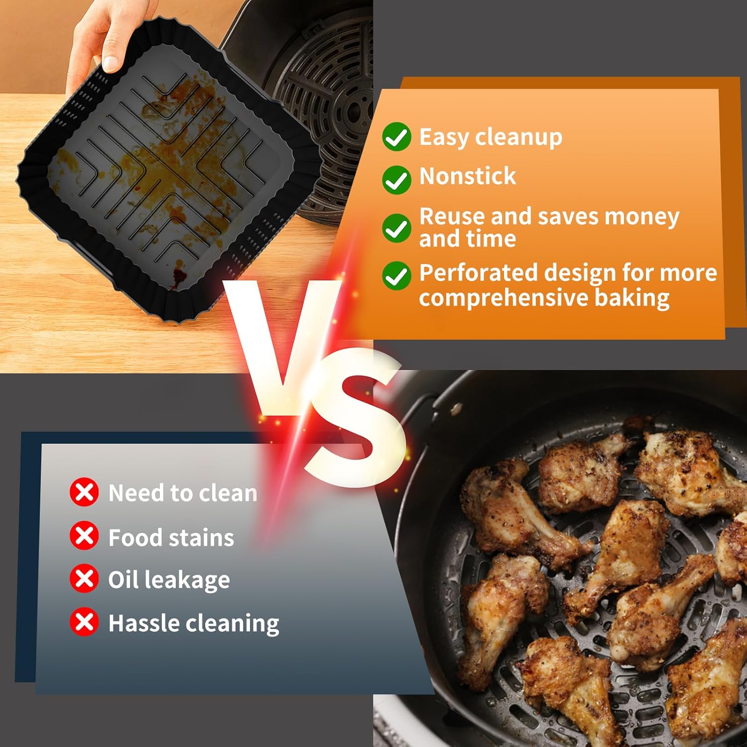 Dual Side Perforated Design: Unlike other ordinary air fryer liners, our square silicone liners are perforated on both sides, which allows the food to be heated more evenly when cooking, and the food bakes out more delicious.