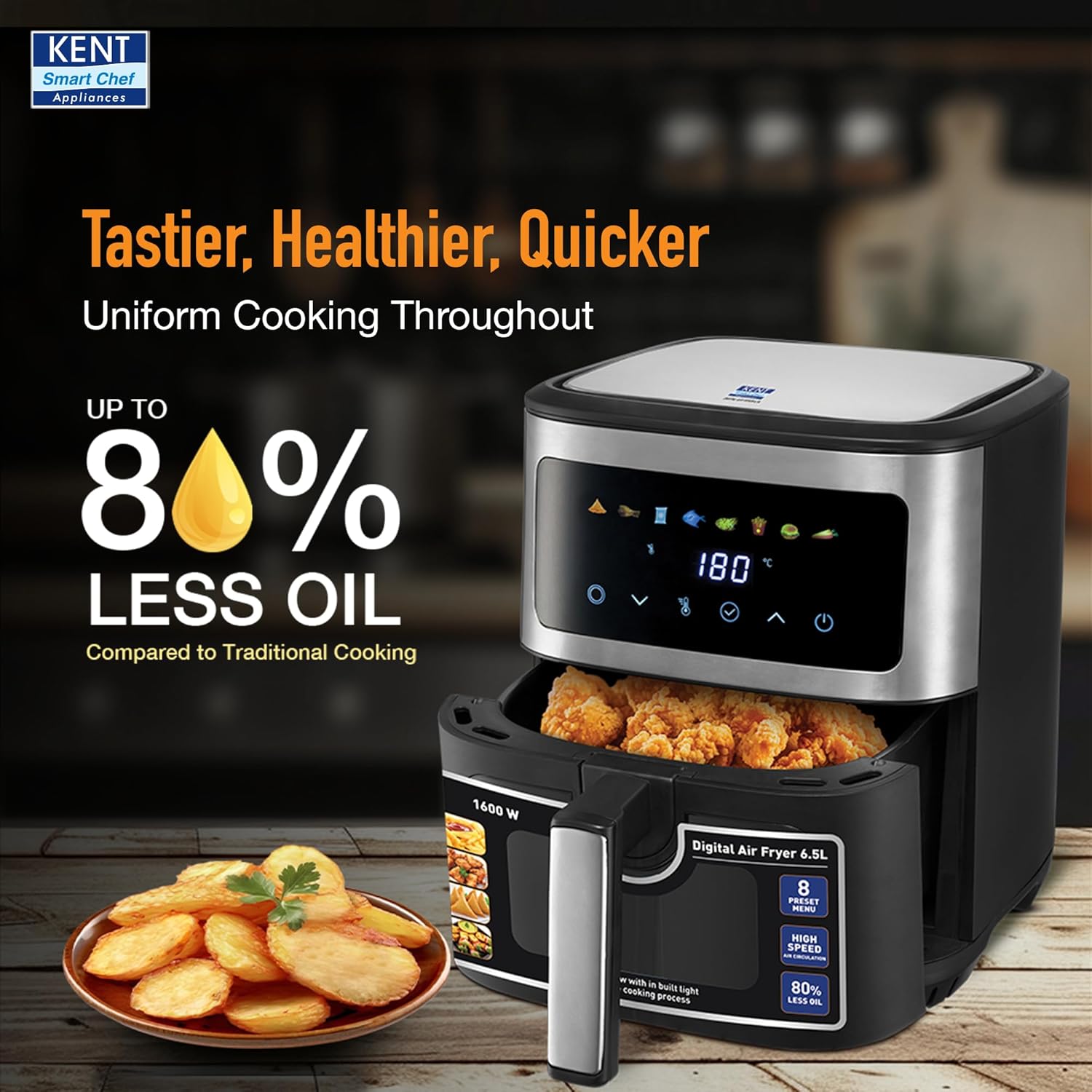 Go-To for Healthier Cooking: Upgrade your kitchen with the KENT Digital Air Fryer 6.5L, powered by 1600W of powerful performance and 360° rapid air technology. It fries, bakes, grills, and roasts using 80% less oil to ensure crispy, delicious results every time.