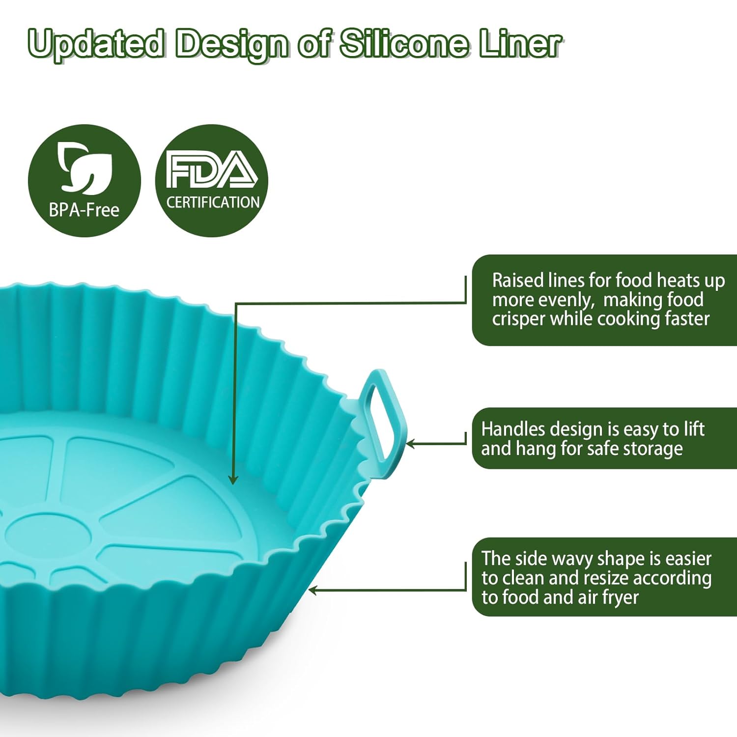 🥗【BPA Free and Reusable Material】Our air fryer silicone liners are made of food-grade silicone, BPA free, 100% safe, ensuring that your meals are cooked in a healthy environment. And heat resistant, reusable, allow you say goodbye to disposable flammable parchment paper liners and embrace durable and reusable silicone air fryer liners.