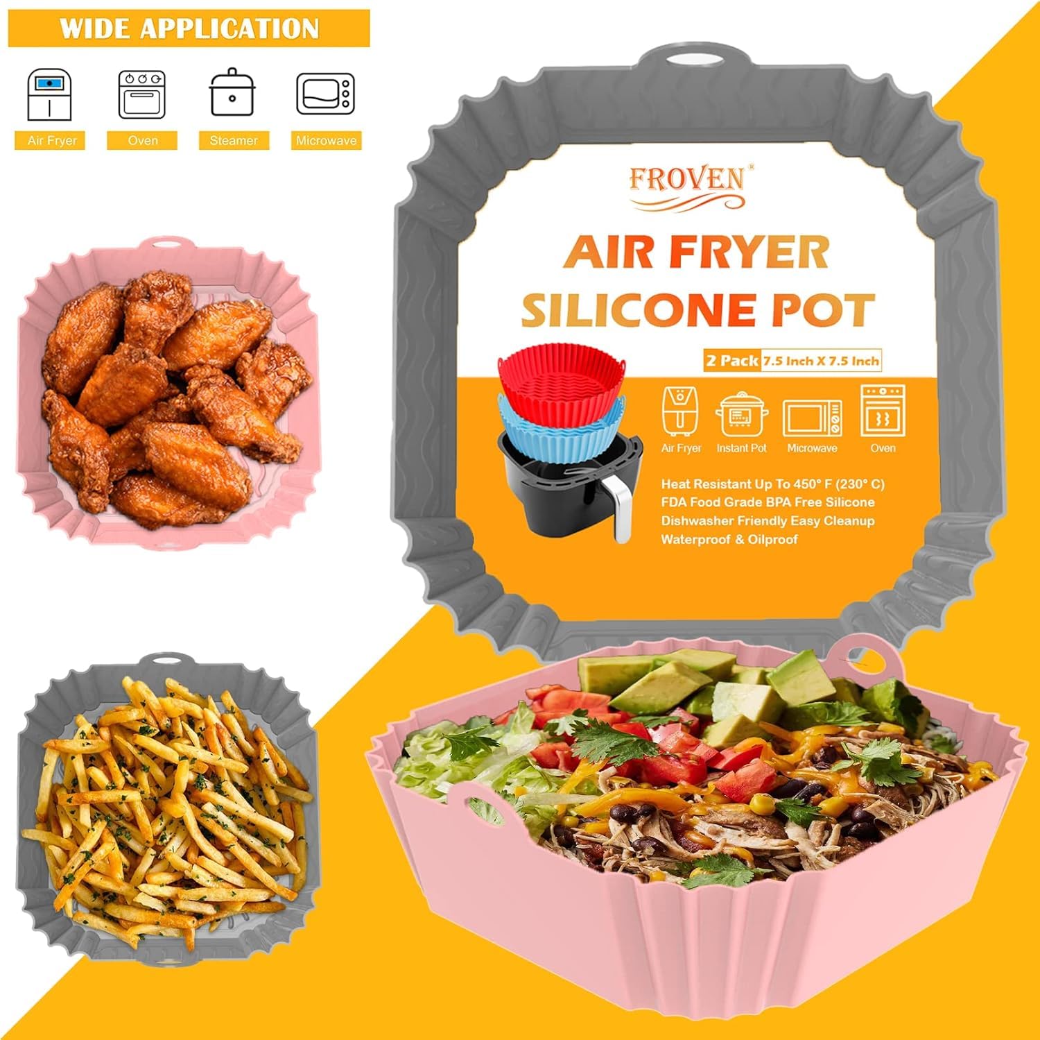 【AIR CIRCULATION & HEAT DISTRIBUTION】 Experience culinary perfection with our Square Air fryer Liners. Engineered for Even Heat Distribution, they ensure uniformly cooked meals without any hot spots. Featuring Enhanced Air Circulation Design, these Silicone Liners guarantee crispy textures while preserving moisture for juicier results. Say goodbye to uneven cooking and soggy dishes – our Thick Pot Liner Inserts deliver consistent, delicious outcomes every time, making mealtime a breeze.